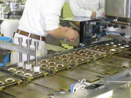 おいしい阿闍梨餅を作っている,満月さんの工場を見学に行ってきました。阿闍梨餅を作っているところを見せてもらったり,材料や,1日に作る数,阿闍梨餅の名前の由来などを教えてもらったりしました。