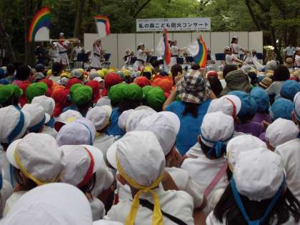 下鴨神社の糺の森で消防署による防火コンサートがありました。音楽隊のコンサートがあったり,消防訓練があったり,楽しい時間でした。特に,盛り上がったのは,はしご車に向かっての玉入れです。めったにない機会ですので,みんな思いきって投げていました。教えてもらったことは,火事を見つけたら「火事だ。」とさけぶことと,地震がおきたら頭を守るです。忘れないでくださいね。