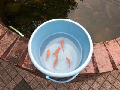 保護者の方から大小合わせて16匹の金魚をいただきました。大きなものはドリームワールドの池に,小さなものは理科室の水槽に入れることにしました。また,理科室で1匹だけ淋しそうにしていた金魚もドリームワールドの池に入れました。
