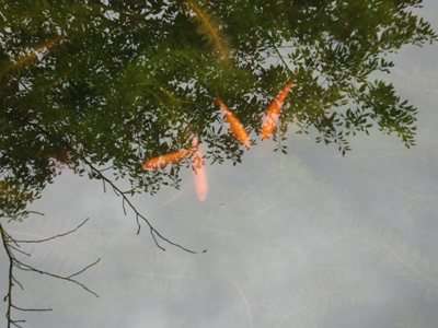 池ではカナダモがずいぶん茂っていることもあり,金魚たちは姿の見えるところをしばらく泳いだ後,モの隙間へすうっと隠れるように入っていきました。