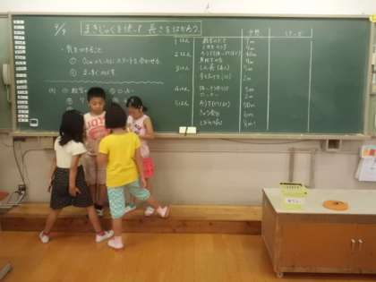 子どもたちは初め,教室の中だけでやっていたのが次第に廊下の長さを測りだしたりと,まきじゃくを使う良さに気付きだしていました。