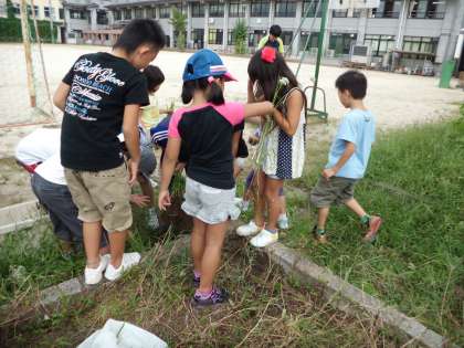 雑草が花だんのまわりにたくさん生えていました。2年生のみんなで,雑草抜きをしました。中には,大きくなりすぎて,なかなか抜けないものもありました。大きなかぶのようにみんなで抜いていました。みんなのおかげできれいになりました。