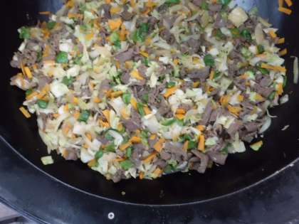 たまねぎ・にんじん・キャベツ・ピーマンなどの野菜と食べごたえのある牛肉を一緒にいためた野菜いためのようなおかずです。