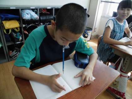 実際に子どもたちは口でペンをくわえ,字を書いてみました。