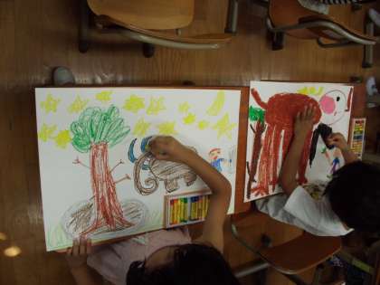 お話の絵に取り組んでいます。お話を聞いて,好きな場面を絵にします。主人公はマンモスです。一人一人マンモスの色や大きさが違います。アイデア勝負です。きっと素敵な作品に仕上がると思います。