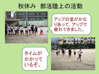 秋休みですが,いつもの時間に集まって陸上の練習が始まりました。今日は普段より練習時間が長く,練習メニューも厳しいものでしたが,みんなよく頑張ってこなしていきました。