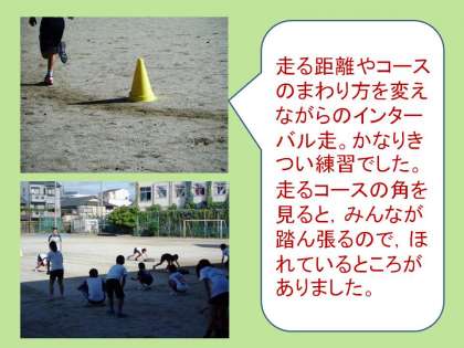 インターバル走のコーンを置いているところをみると,走るコースの角の部分なので,他の場所より掘れていることがわかります。これまでの練習でついてきたものでしょうが,陸上部みんなの努力の足跡だと感心しました。