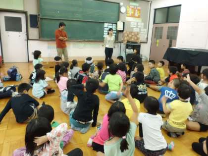 1,2年生で集まり,「聞く」学習をしました。先生の話や友だちの話をしっかり聞くことの大切さを話し合いました。その後,ステレオゲームをしました。2人の先生が同時に別の言葉を言います。何を言ったのか当てるゲームです。かんたんそうですが,意外に難しいのです。話を聞く楽しさを味わえた1時間でした。