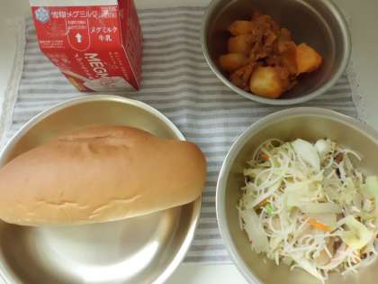 給食では,ビーフンをたっぷりの野菜と一緒に炒めました。