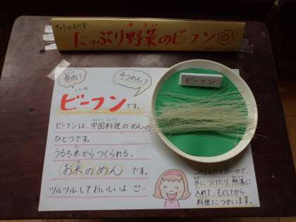 給食室の前には,お湯で戻す前のビーフンを展示しました。