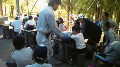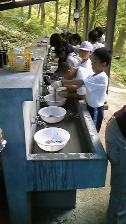 5年長期宿泊学習の午前中の取組の魚つかみも時折パラパラと小雨が降る程度で実施できました。そして,とったイワナをしっかり焼きおいしくいただき今昼食がすんだところです。