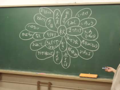 秋と聞いて思いつく言葉をみんなで出し合いました。食べ物や行事,自然に関するものなどをたくさん見つけることができました。