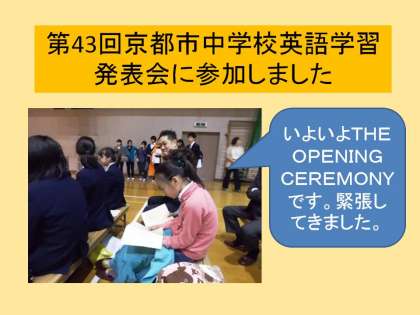 11月3日に洛友中学校で行われた「第43回京都市中学校英語学習発表会」に,本校児童2名が「SPECIAL PERFOEMANCE:英語で楽しむスチューデント・シティ」で参加しました。