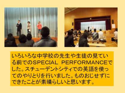 中学生のRECITATIONS(暗唱)やSTAGE PERFORMANCEの前でしたので,緊張感がありましたが,堂々と参加することができました。