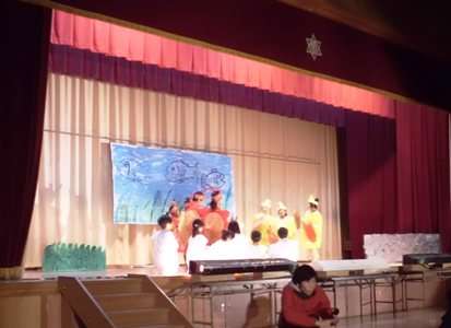 はじめの会で,1年生のはじめの言葉が終わると,2年生の劇「へんしん!スーパーザリガニマン」でした。