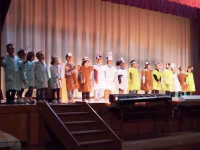次は1年生の劇「ランチタイム」でした。カレーのルーを作るのにとてもたくさんのものが使われていることを知りました。その中に,牛乳も入っています。牛乳が少し飲みにくい子どもが何とか飲めるように,周りの子どもたちが声をかけている様子が,普段の生活と重なりました。