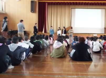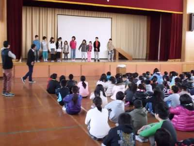 児童会代表からは今月の目標についてクイズをまじえて説明がありました。今月の目標のねらいは文末に「です」「ます」をつけるなど,丁寧な言葉づかいをしましょうということです。学級代表の協力もあって,舞台で場面を設定した中でのクイズでした。