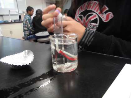 まず最初の実験は毛糸を色のついた油の中にいれ,その毛糸を水の中にしずめます。
