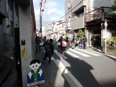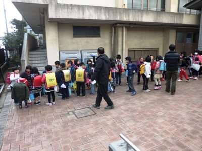 写真は集団下校の様子です。帰る途中にある110番の家などの確認をしました。