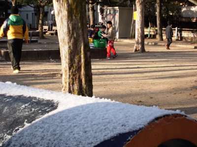 雪が少し積もった朝。登校中の雪に目をうばわれていた子どもたち。中には,雪玉を作って得意そうな顔の子もいました。飛鳥井公園にも雪が積もっていて,ゴミよりもそちらの方に気がいっていた子もいましたが,今日の天気なら仕方ないですね。