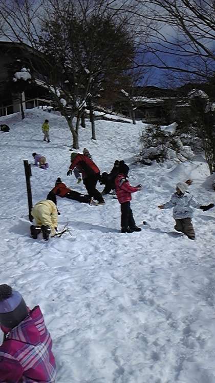 午後1時より雪遊び・そり遊びを行いました。天候と雪に恵まれ,思う存分雪を楽しむことができました。これだけ多くの雪にふれる経験の少ない都会の子どもたちです。雪をさわるのが嬉しかったみたいで,たくさんの雪だるまを作りました。可愛く並ぶ雪だるまが見つけてもらえますか。体が冷えたのでおふろに先に入ります。夜のキャンドルファイヤーも楽しみです。