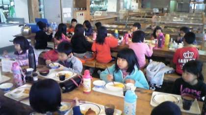 今日の天気は曇で細かな雪が舞っています。外の気温は−2度。寒さに負けず,しっかり活動するにはまず食事です。子どもたちの朝ごはんの様子です。みんな食欲旺盛です。今日も元気に活動できそうです。