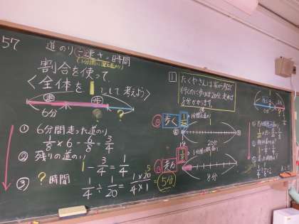線分図,速さの公式,分数の計算などを使い答えを導き出します。