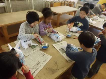 おにのお面を作っています。新聞紙に和紙をはり,それを固めたものに色をつけています。表情豊かな鬼がたくさんいます。完成した鬼のお面,見に来てください。
