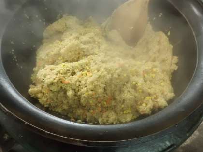 カレーピラフは,まぐろフレーク・乾燥玉ねぎ・乾燥にんじん・粒コーンを使って作りました。給食室の大きなお釜で,ふっくらと炊きあげます。