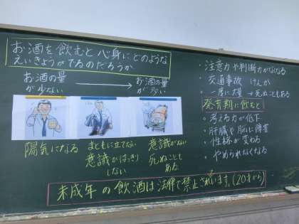 性格が変わる,考える力が低下するなど20歳未満では飲むことができないことも学びました。今日は高野中学の先生方が見に来られていました。