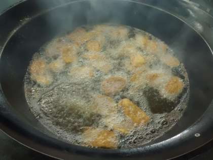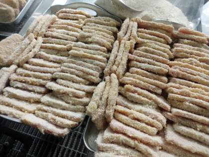 1枚の大きな豚肉に衣をつけて,油で揚げました★