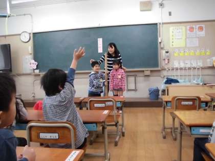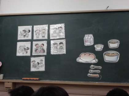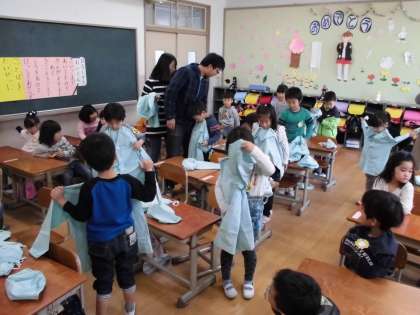 初めての給食です。栄養の先生から,はじめに給食室で使う大きなじゃもじを見せてもらいました。あまりの大きさにみんなびっくりです。次に,給食の7つの約束と,給食の内容についてお話がありました。最後は,エプロンのたたみ方です。歌に合わせて楽しくたたみ方を習いました。まだまだ難しいようですが,これからできるようになりますね。給食は,おかわりをもっと欲しいという子がたくさんいました。これからもおいしい給食楽しみですね。