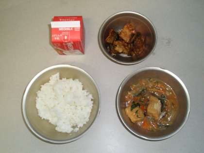 今日の給食は,ごはん・牛乳・さんまのかばやき風・厚揚げの野菜あんかけでした。