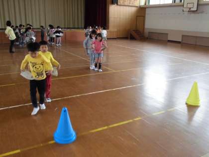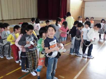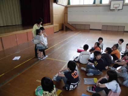 月1回,人権に関わる学習をしています。4月は,協力がテーマです。新聞紙に穴をあけ,2人で破かないようにして,リレーをしました。1回目は,すぐに破けてしまい,リレーになりませんでした。2回目は,どのペアも破けることなく,いい勝負でした。子どもたちから,「協力すると出来るようになった。」「協力すると楽しい。」といった声がありました。成功体験を通して,協力することの大切さを学ぶことができました。