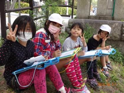 三・四時間目には理科の授業で鴨川に自然観察をしに行きました。それぞれが見つけた「春の草花」を虫眼鏡で観察して熱心にプリントにスケッチしている姿が見られました。
