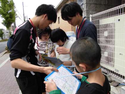 今日は御所まで探検に行きました。地図の学習をしている子ども達は地図を持って行ったので,今いる場所が地図上のどこか分かると「あ,ここや!」と喜んでいました。「東大路通り」や「今出川通り」等,学校の周りの大きな通りの名前も覚えることができました。今日学んだことをこれからの校外学習で活かしていけるといいですね。