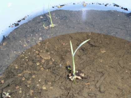 みんなの育てている「バケツ苗」が大きくなり始めました。1番大きな苗は1年生の苗です。はじめは苗がなかなか出てこなかったのでみんな不安そうでしたが少しホッとしたようです。成果が出たので稲に水をあげることも楽しくなってきました。
