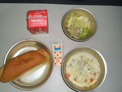 今日の給食は,コッペパン・牛乳・ハムサンド・マカロニのクリームシチューでした。ハム・じゃがいも・キャベツの具を各自でマヨネーズとあえて,パンにはさんで食べました。マカロニのシチューは,にんじん・コーン・パセリが入りいろどりもきれいでした。マカロニもたくさん入っていて,ボリューム満点でした。