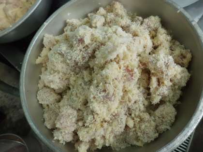 給食のチキンカツは,全て手作りです。鶏肉に塩・こしょうをし,小麦粉・卵・パン粉と一つ一つ丁寧につけ,高温の油でサクッと揚げていきます。