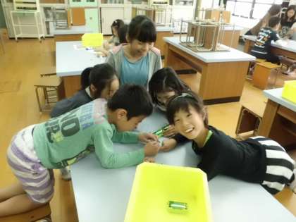 理科の授業で「電池のはたらき」を学習しています。今回は「直列つなぎ」と「並列つなぎ」を,モーターが回る速さでちがいを確認する実験をしました。つなぎ方によって,モーターの回る速さが変わることを見つけた子どもたちの目はとても輝いてました。