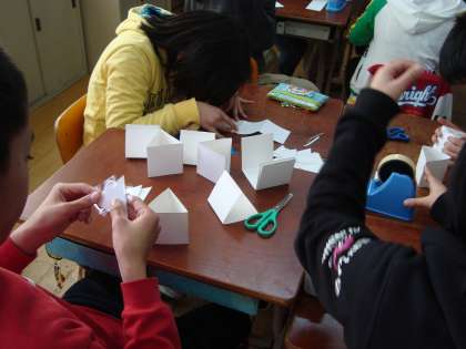 当日の授業内容は三角柱を6つ組み合わせて立体を作り,それらを張り合わせることで形の変わる六角柱を作りました。面には和紙で色づけすることで,形を変えるたびに模様が変わるようにしました。みんな熱心に取り組み,楽しく活動をすることができました。2か月後には新たな教科もいくつかスタートします。中学校に向けて期待を膨らませた出前授業でした。