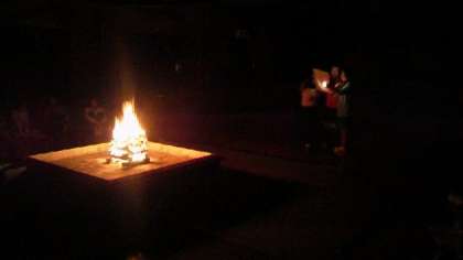 夕食の後はキャンプファイヤーですが,雨が心配されていたこともあり,室内でのキャンプファイヤーとなりました。先に反省会等をすませ,8時過ぎからのファイヤーでしたが,大変盛り上がりました。楽しい時間となりました。楽しい一日目が終わろうとしています。明日は磯浜観察や野外炊事があります。しっかり寝て明日に備えてほしいですね。