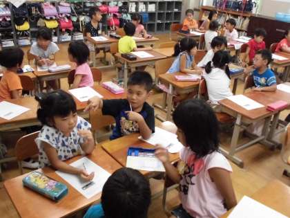 今月のテーマは「障害について考える」です。障害をもっている人に対する偏見がまだ世の中にあります。そういう偏見をもたない子どもたちに育てていきたいと考えています。今日は,「しょうぼうじどうしゃ じぷた」を読み,人との違いについて考えました。小さいからだめではなく,小さいからこそ,せまい道でも進むことができ,火事を消せるのです。人それぞれ違いを認め合い,お互いの良さを見つけることのできる人間になっほしいと思います。最後は,クラスの友だちのよいところを見つけをしました。