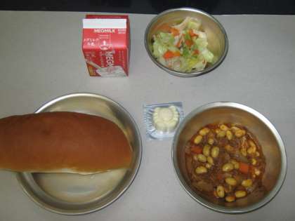 今日の給食は,ミルクコッペパン・牛乳・チリコンカーン・きのこのソティ・チーズでした。きのこのソティは新しい献立でした。エリンギと生しいたけを使い,ベーコン・キャベツ・にんじんと一緒にオリーブオイルでいためました。きのこが苦手な子どもが多いのですが,きのこより野菜のほうが多く頑張って食べていました。