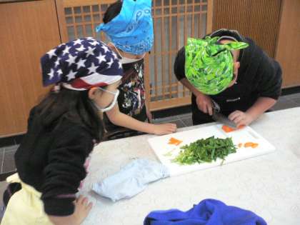 グループごとにニラやにんじんを切ったり、かき混ぜたりしました。