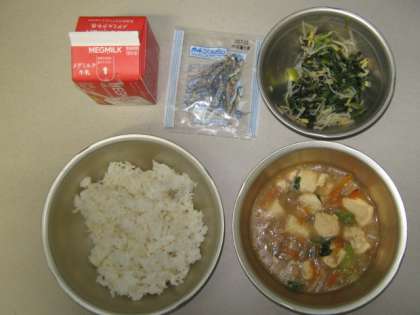 今日の給食は,麦ごはん・牛乳・五目どうふ・ほうれん草ともやしのいためナムル・じゃこでした。今日は全校縦割りのスマイル給食で,1年生から6年生まで12のグループに分かれて仲良く給食を食べました。今日の献立はみんな早く食べることが出来ました。