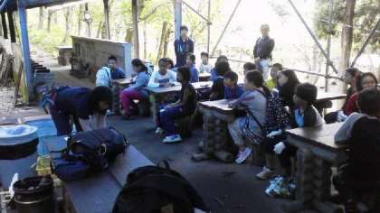 野外炊事でちゃんこ鍋作りです。なたで薪を割ることから始まります。苦労しながらわっていました。今はガスコンロや電気コンロがスイッチ一つでつきます。昔の人の苦労も体験できたことでしょう。段取りを考えて,ちゃんこ鍋の材料を切ったり,火をおこしたりしました。さて上手にできるでしょうか・・・。