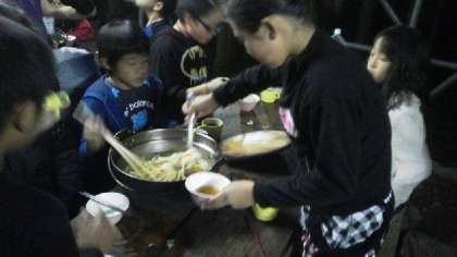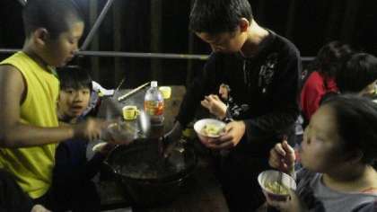 ちゃんこ鍋はおいしく上手にでき上がりました。自分たちで作った料理の味は最高です。おかわりをいっぱいして満足した子どもたち。笑顔で食べていました。