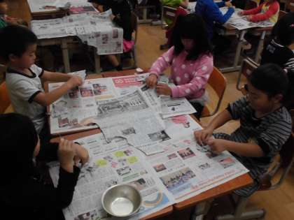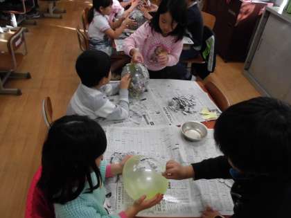 学習発表会の小道具作りです。風船に新聞紙をはっています。学習発表会に向けて,みんなで頑張っていきます。