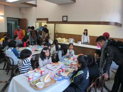 今日はランチルームで,陶器の食器を使った給食でした。
